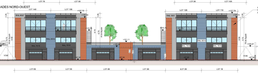 10 lots d’ateliers de 120 à 140m² chacun au sol, porte sectionnelle 3x3m, 3,5 m de hauteur de plafond.