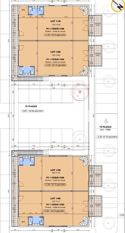 Également 4 lots de bureaux de 120 m² chacun avec possibilité de communiquer avec les ateliers du dessous.
